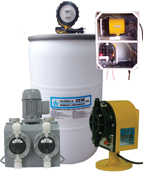 Bomba Dosadora modelo Zew MKBD-PM1/PM2 com sistema de Pulsação Magnética com de vazão de 10L e 20L/hora. Bomba Dosadora modelo Zew MKBD-PROG de diafragma com sistema de Programação e vazão até 70L/hora. Bombas Dosadoras modelo Zew MKBD-1/2/4 com sistema de Mecânica Articulado com vazão de 70 a 120L/hora por cabeçote.