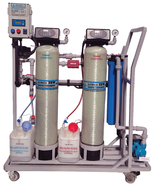 O Sistema Desmineralizador, compacto e automático através de leitura do condutivimetro digital, faz o processo de deionização através de trocas iônicas com resinas catiônicas e aniônicas, tornando a água pura e cristalina, isenta de sais minerais, evitando formação de incrustações, garantindo utilização segura diversos segmentos para uso industrial. O Filtro de Carvão Ativo instalado previamente no sistema, elimina gás clorídrico e a coloração proveniente de material orgânico, aumentando a vida útil das resinas de troca iônica.
