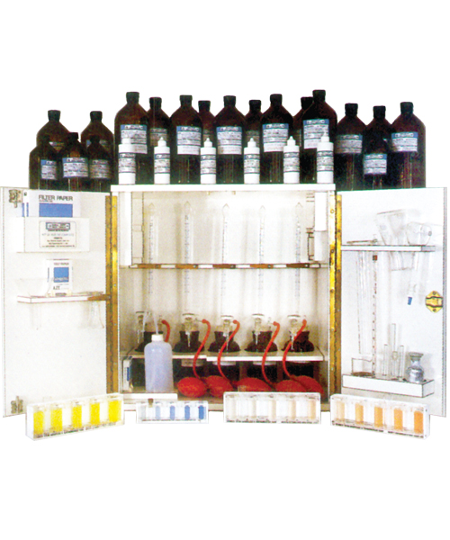 Determinação rápida e precisa dos principais parâmetros referentes a água de caldeiras. Possibilita o controle diário da água da caldeira, através de correções nas adições de produtos químicos. Todos os assessórios são fixados por suporte em um gabinete de fórmica.